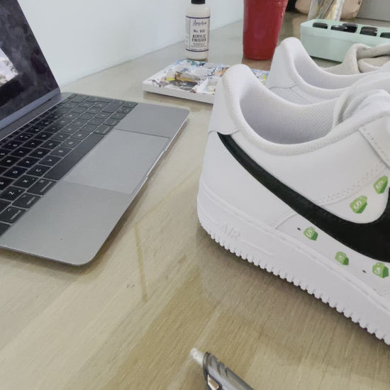 One of a kind custom Shopify sneaker. Crafted by hand with the iconic shopping bag decorating the front and side of the sneaker. With these kicks, you'll be checked out while you checkout.